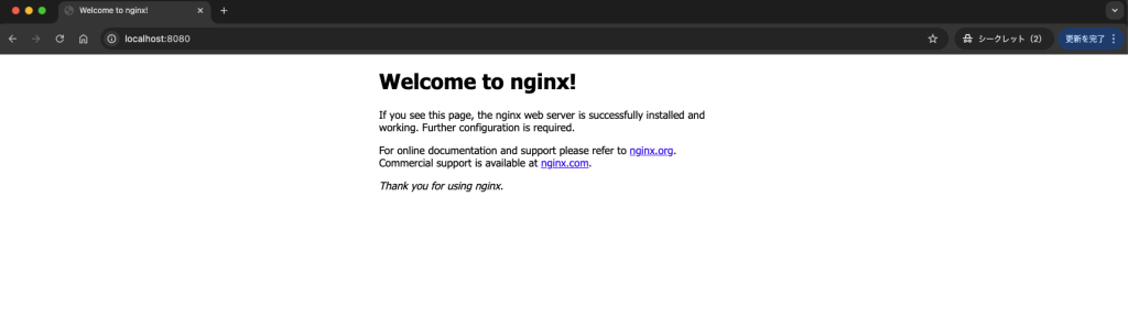 以下のコマンドを実行し、nginxのコンテナを作成します。